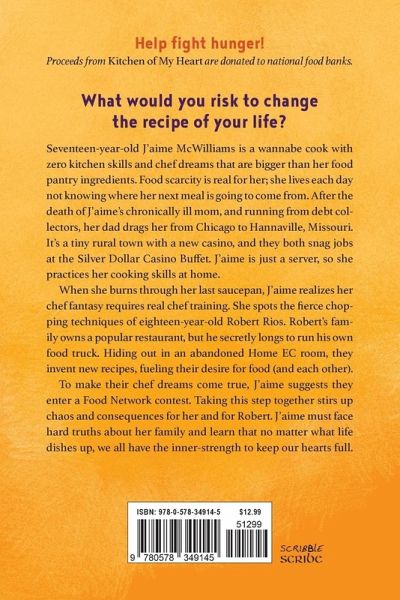 What would you risk to change the recipe of your life? Seventeen-year-old J'aime McWilliams is a wannabe cook with zero kitchen skills and chef dreams that are bigger than her food pantry ingredients. Food scarcity is real for her; she lives each day not knowing where her next meal is going to come from. After the death of J'aime's chronically ill mom, and running from debt collectors, her dad drags her from Chicago to Hannaville, Missouri. It's a tiny rural town with a new casino, and they both snag jobs at the Silver Dollar Casino Buffet. J'aime is just a server, so she practices her cooking skills at home. When she burns through her last saucepan, J'aime realizes her chef fantasy requires real chef training. She spots the fierce chopping techniques of eighteen-year-old Robert Rios. Robert's family owns a popular restaurant, but he secretly longs to run his own food truck. Hiding out in an abandoned Home EC room, they invent new recipes, fueling their desire for food (and each other). To make their chef dreams come true, J'aime suggests they enter a Food Network contest. Taking this step together stirs up chaos and consequences for her and for Robert. J'aime must face hard truths about her family and learn that no matter what life dishes up, we all have the inner-strength to keep our hearts full. Proceeds from Kitchen of My Heart are donated to national food banks.