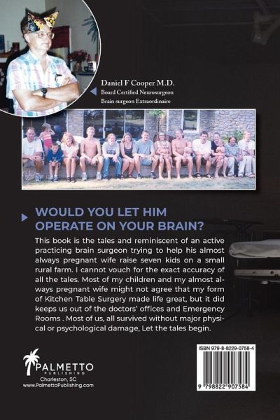 Enter the unbelievable; knee-slapping; and sometimes exaggerated life of Dr. Daniel Cooper; his "perpetually-pregnant" wife; their seven kids; and his career as a neurosurgeon. Kitchen Table Surgery is a humorous memoir from Dr. Daniel Cooper: a full-time neurosurgeon; part-time novice farmer raising seven kids on a small farm with an almost always pregnant wife. The neurosurgeon had to treat his seven children for their multiple injuries and illnesses - or he would have to spend his whole life in urgent care centers! Among the many stories chronicled: the removal of fishing hooks from nearly every body part; buying (and learning to treat) a sick horse; and how to endure the scourge of Mother Nature when you gather flowers and receive chiggers and poison ivy in return. Readers will resonate with Daniel's seemingly always-pregnant wife; his children's trials and tribulations; and the funny family moments along the way.