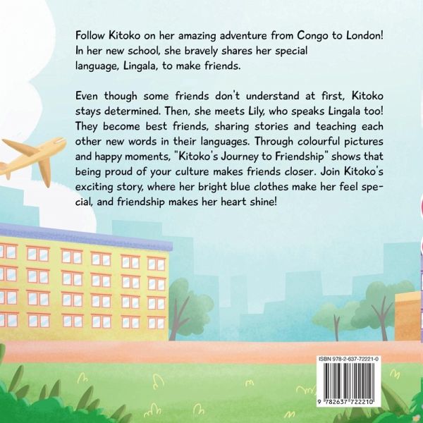 Kitoko's Journey to Friendship: An Adventure in Cultures and Languages (Ages 4-7): Join Kitoko on a vibrant journey filled with new friends, colorful pictures, and the magic of understanding! From her sunny home in Congo, she travels to London to see her dad, bravely bringing her special language, Lingala, with her. Even when some don't understand at first, Kitoko stays determined, her bright blue clothes a beacon of her unique spirit. But when she meets Lily, who learns to speak Lingala, her heart lights up! Suddenly, friendship blooms, and a joyful exchange of words: "Mbote!" Wave hello with Kitoko and learn what it means."Moninga!" Kitoko becomes 'friends' with Lily."Lipa, Etabe, Liki!" Join the fun as Kitoko and Lily teach each other about food: Bread, Banana, Egg! With captivating illustrations and heartwarming moments, "Kitoko's Journey to Friendship" shows young readers that embracing their heritage connects them to others in extraordinary ways. It's a short story about celebrating differences, finding common ground, and the joy of friendship that shines brighter than any language barrier. Get ready to: Learn basic Lingala words and phrases.Discover the power of friendship and acceptance.Be inspired by Kitoko's courage and bright spirit. Perfect for: Parents and teachers looking for diverse children's stories.Young readers ages 4-7 interested in different cultures and languages.Anyone who believes in the magic of friendship! Start Kitoko's adventure today and open hearts to a world of friendship! Keywords: Diverse children's stories; Multicultural books for kids; Lingala language learning; Kids learning languages; Children's book about friendship; Cultural diversity for kids; Teaching basic words in Lingala; Early language learning; Bilingual children's books; African languages for kids; Books for young readers; Ages 4-7 learning books; Friendship books for kids; Educational adventures; Multicultural education; Learning through stories
