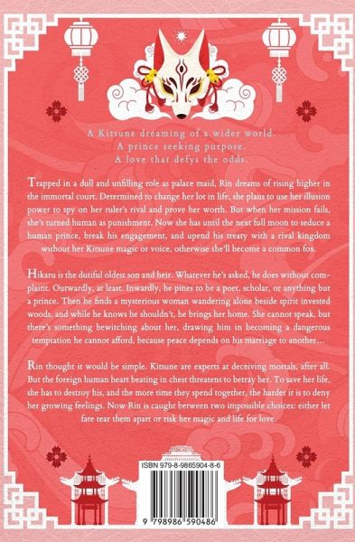 A Kitsune dreaming of a wider world. A prince seeking purpose. A love that defies the odds. Trapped in a dull and unfilling role as palace maid, Rin dreams of rising higher in the immortal court. Determined to change her lot in life, she plans to use her illusion power to spy on her ruler's rival and prove her worth. But when her mission fails, she's turned human as punishment. Now she has until the next full moon to seduce a human prince, break his engagement, and upend his treaty with a rival kingdom without her Kitsune magic or voice, otherwise she'll become a common fox. Hikaru is the dutiful oldest son and heir. Whatever he's asked, he does without complaint. Outwardly, at least. Inwardly, he pines to be a poet, scholar, or anything but a prince. Then he finds a mysterious woman wandering alone beside spirit invested woods, and while he knows he shouldn't, he brings her home. She cannot speak, but there's something bewitching about her, drawing him in becoming a dangerous temptation he cannot afford, because peace depends on his marriage to another... Rin thought it would be simple. Kitsune are experts at deceiving mortals, after all. But the foreign human heart beating in chest threatens to betray her. To save her life, she has to destroy his, and the more time they spend together, the harder it is to deny her growing feelings. Now Rin is caught between two impossible choices: either let fate tear them apart or risk her magic and life for love.