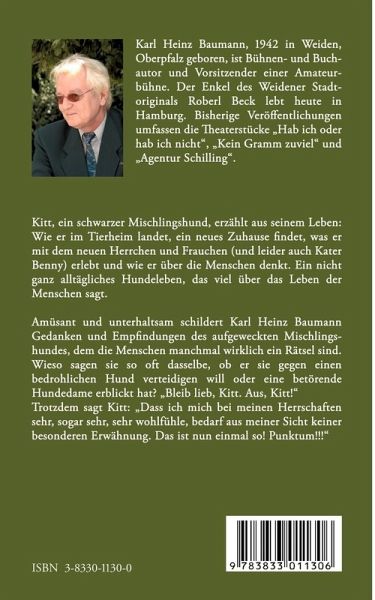 Amüsant und unterhaltsam schildert Karl Heinz Baumann Gedanken und Empfindungen des aufgeweckten Mischlingshundes, dem die Menschen manchmal wirklich ein Rätsel sind. Wieso sagen sie oft dasselbe, ob er sie gegen einen bedrohlichen Hund verteidigen will oder eine betörende Hundedame erblickt hat? "Bleib lieb, Kitt. Aus, Kitt!" Trotzdem sagt Kitt: "Dass ich mich bei meinen Herrschaften sehr, sogar sehr, sehr wohlfühle, bedarf aus meiner Sicht keiner besonderen Erwähnung. Das ist nun einmal so! Punktum!!!"