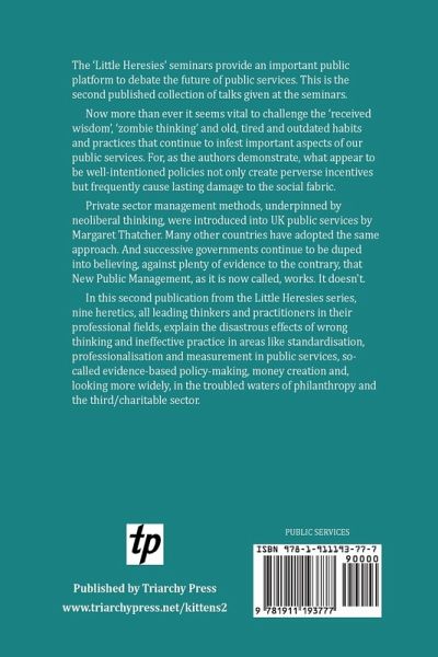 The 'Little Heresies' seminars - this is the second published collection of the talks given at them - provide an important public platform to debate the future of public services. Now more than ever it seems vital to challenge the 'received wisdom', 'zombie thinking' and old, tired and outdated habits and practices that continue to infest important aspects of our public services. For, as the authors demonstrate, what appear to be well-intentioned policies not only create perverse incentives but frequently cause lasting damage to the social fabric. Private sector management methods, underpinned by neoliberal thinking, were introduced into UK public services by Margaret Thatcher. Many other countries have adopted the same approach. And successive governments continue to be duped into believing, against plenty of evidence to the contrary, that New Public Management, as it is now called, works. It doesn't. In this second publication from the Little Heresies series, nine heretics, all leading thinkers and practitioners in their professional fields, explain the disastrous effects of wrong thinking and ineffective practice in areas like standardisation, professionalisation and measurement in public services, so-called evidence-based policy-making, money creation and, looking more widely, in the troubled waters of philanthropy and the third/charitable sector.