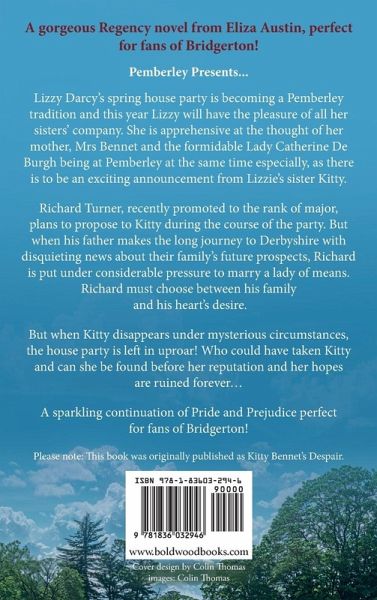 A gorgeous Regency romp of a novel from Eliza Austin, perfect for fans of Bridgerton! Pemberley Presents... Lizzy Darcy's spring house party is becoming a Pemberley tradition and this year Lizzy will have the pleasure of all her sisters' company. She is apprehensive at the thought of her mother, Mrs Bennet and the formidable Lady Catherine De Burgh being at Pemberley at the same time especially, as there is to be an exciting announcement from Lizzie's sister Kitty. Richard Turner, recently promoted to the rank of major, plans to propose to Kitty during the course of the party. But when his father makes the long journey to Derbyshire with disquieting news about their family's future prospects, Richard is put under considerable pressure to marry a lady of means. Richard must choose between his family and his heart's desire. But when Kitty disappears under mysterious circumstances, the house party is left in uproar! Who could have taken Kitty and can she be found before her reputation and her hopes are ruined forever... A sparkling continuation of Pride and Prejudice perfect for fans of Julia Quinn, Eloisa James and Mary Balogh Please note: This book was originally published as Kitty Bennet's Despair.
