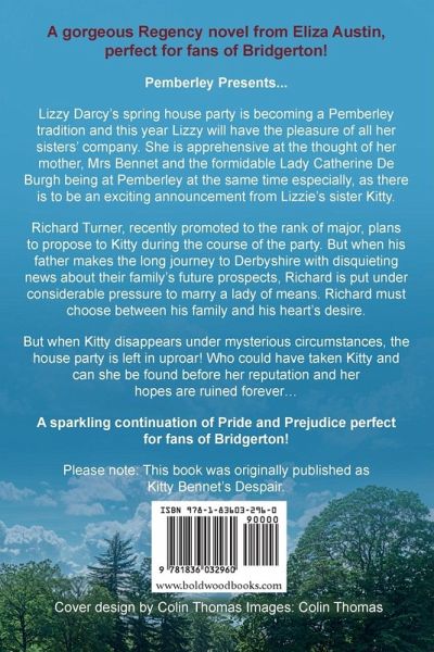 A gorgeous Regency romp of a novel from Eliza Austin, perfect for fans of Bridgerton! Pemberley Presents... Lizzy Darcy's spring house party is becoming a Pemberley tradition and this year Lizzy will have the pleasure of all her sisters' company. She is apprehensive at the thought of her mother, Mrs Bennet and the formidable Lady Catherine De Burgh being at Pemberley at the same time especially, as there is to be an exciting announcement from Lizzie's sister Kitty. Richard Turner, recently promoted to the rank of major, plans to propose to Kitty during the course of the party. But when his father makes the long journey to Derbyshire with disquieting news about their family's future prospects, Richard is put under considerable pressure to marry a lady of means. Richard must choose between his family and his heart's desire. But when Kitty disappears under mysterious circumstances, the house party is left in uproar! Who could have taken Kitty and can she be found before her reputation and her hopes are ruined forever... A sparkling continuation of Pride and Prejudice perfect for fans of Julia Quinn, Eloisa James and Mary Balogh Please note: This book was originally published as Kitty Bennet's Despair.