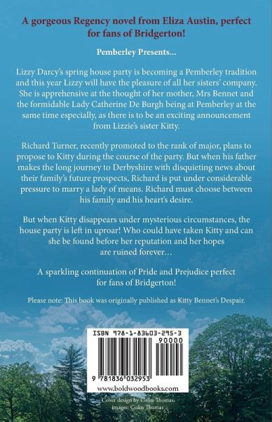 A gorgeous Regency novel from Eliza Austin, perfect for fans of Bridgerton! Pemberley Presents... Lizzy Darcy's spring house party is becoming a Pemberley tradition and this year Lizzy will have the pleasure of all her sisters' company. She is apprehensive at the thought of her mother, Mrs Bennet and the formidable Lady Catherine De Burgh being at Pemberley at the same time especially, as there is to be an exciting announcement from Lizzie's sister Kitty. Richard Turner, recently promoted to the rank of major, plans to propose to Kitty during the course of the party. But when his father makes the long journey to Derbyshire with disquieting news about their family's future prospects, Richard is put under considerable pressure to marry a lady of means. Richard must choose between his family and his heart's desire. But when Kitty disappears under mysterious circumstances, the house party is left in uproar! Who could have taken Kitty and can she be found before her reputation and her hopes are ruined forever... A sparkling continuation of Pride and Prejudice perfect for fans of Bridgerton! Please note: This book was originally published as Kitty Bennet's Despair.