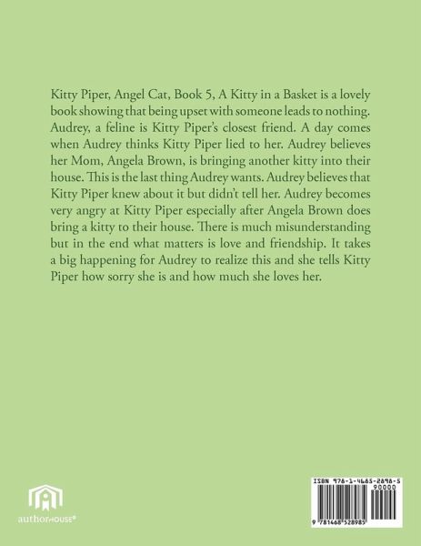 Kitty Piper, Angel Cat, Book 5, A Kitty in a Basket is a lovely book showing that being upset with someone leads to nothing. Audrey, a feline is Kitty Piper's closest friend. A day comes when Audrey thinks Kitty Piper lied to her. Audrey believes her Mom, Angela Brown, is bringing another kitty into their house. This is the last thing Audrey wants. Audrey believes that Kitty Piper knew about it but didn't tell her. Audrey becomes very angry at Kitty Piper especially after Angela Brown does bring a kitty to their house. There is much misunderstanding but in the end what matters is love and friendship. It takes a big happening for Audrey to realize this and she tells Kitty Piper how sorry she is and how much she loves her.