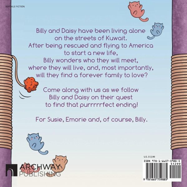 Billy and Daisy have been living alone on the streets of Kuwait. After being rescued and flying to America to start a new life, Billy wonders who they will meet, where they will live, and, most importantly, will they find a forever family to love? Come along with us as we follow Billy and Daisy on their quest to find that purrrrrfect ending! For Susie, Emorie and, of course, Billy.