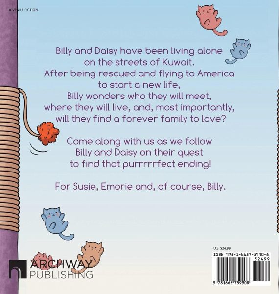 Billy and Daisy have been living alone on the streets of Kuwait. After being rescued and flying to America to start a new life, Billy wonders who they will meet, where they will live, and, most importantly, will they find a forever family to love? Come along with us as we follow Billy and Daisy on their quest to find that purrrrrfect ending! For Susie, Emorie and, of course, Billy.