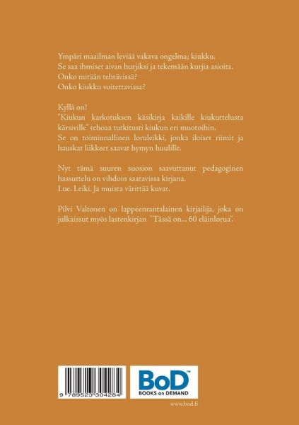 Kiukun karkotuksen käsikirja kaikille kiukuttelusta kärsiville on toiminnallinen loruleikki. Mukavat riimit ja hauskat liikkeet vievät ajatukset pois kiukusta ja saavat iloiselle mielelle. Sadat lapset ovat leikkineet Kiukun karkotus -leikkiä Valtosen ohjaamana ja onpa siihen turvautunut joukko aikuisiakin. Nyt tämä varhaiskasvattajien kehuma pedagoginen hassuttelu on vihdoin saatavilla kirjana. Lue. Leiki. Ja muista värittää kuvat.