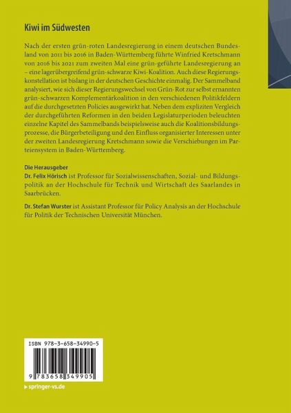 Nach der ersten grün-roten Landesregierung in einem deutschen Bundesland von 2011 bis 2016 in Baden-Württemberg führte Winfried Kretschmann von 2016 bis 2021 zum zweiten Mal eine grün-geführte Landesregierung an - eine lagerübergreifend grün-schwarze Kiwi-Koalition. Auch diese Regierungskonstellation ist bislang in der deutschen Geschichte einmalig. Der Sammelband analysiert, wie sich dieser Regierungswechsel von Grün-Rot zur selbst ernannten grün-schwarzen Komplementärkoalition in den verschiedenen Politikfeldern auf die durchgesetzten Policies ausgewirkt hat. Neben dem expliziten Vergleich der durchgeführten Reformen in den beiden Legislaturperioden beleuchten einzelne Kapitel des Sammelbands beispielsweise auch die Koalitionsbildungsprozesse, die Bürgerbeteiligung und den Einfluss organisierter Interessen unter der zweiten Landesregierung Kretschmann sowie die Verschiebungen im Parteiensystem in Baden-Württemberg.