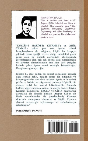 "KUR'AN-I HAKIM'de KIYAMET'e ve AHIR ZAMAN'a bakan pek cok Ayetin cifirsel hesaplamalarini ele aldigimiz, kucuk bir kitapcik seklinde fakat icerigi ve ele aldigi meseleler gayet genis olan bu onemli eserde, ahirzamanda gerceklesecek olan pek cok önemli dini meseleden (Hz. MEHDI'nin ve Hz. ISA'nin GELISI, GUNES'IN BATIDAN DOGMASI, YE'CUC VE ME'CUC'UN ve DECCAL'IN CIKISI ile DABBET-UL ARZ meseleleri detaylica anlatilmis ve GORSEL OGELERLE zenginlestirilerek, belki de TARIH'de ilk kez bu denli detaylarina inilerek GERCEKCI olarak onlarca makale ve resimle canlandirilmaya calisilmistir. Kiyamet alametlerinden kisa kisa ozet parcalar halinde, yalniz isaret etmek suretiyle bahsedecegimiz bu onemli ve "KIYAMET GERCEKLIGI KULLIYATI"nin ilk eserinde, bu konularin detaylarina ayrintili olarak girecegiz. EBCED ve CIFIR hesaplarina dayanarak ele almakla birlikte, Kiyamet surecini olusturan 6 Buyuk Kiyamet alameti ve 114 adet Kucuk Kiyamet alameti de, detaylariyla ac