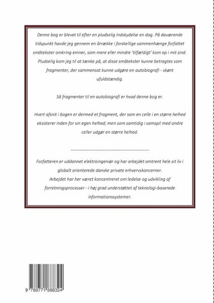 Denne bog er blevet til efter en pludselig indskydelse en dag. På daværende tidspunkt havde jeg gennem en årrække i forskellige sammenhænge forfattet småtekster omkring emner, som mere eller mindre 'tilfældigt' kom op i mit sind. Pludselig kom jeg til at tænke på, at disse småtekster kunne betragtes som fragmenter, der sammensat kunne udgøre en autobiografi - skønt ufuldstændig. Så fragmenter til en autobiografi er hvad denne bog er. Hvert afsnit i bogen er dermed et fragment, der som en celle i en større helhed eksisterer inden for sin egen helhed; men som samtidig i samspil med andre celler udgør en større helhed.