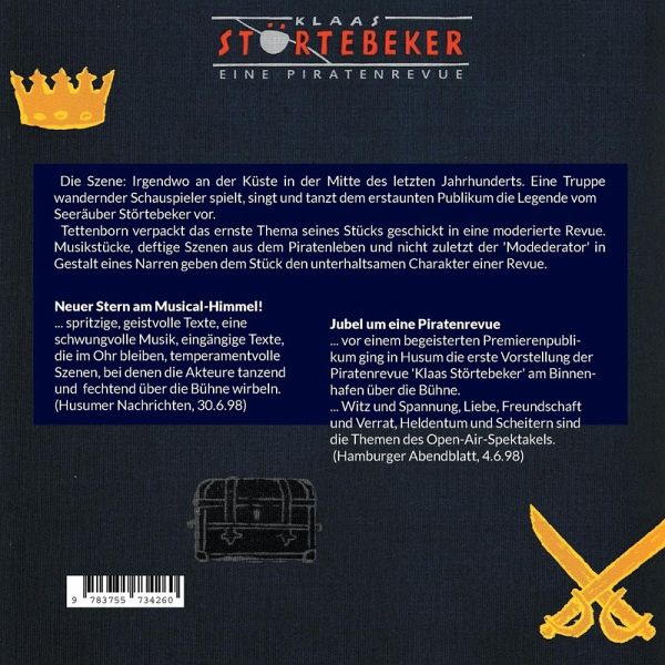 Textbuch zu KLAAS STÖRTEBER - EINE PIRATENRVUE, die 1998 in Husum uraufgeführt wurde. Enthalten sind auch die Songtexte, Informationen zur Aufführung, zur Entstehung des Thaterstücks und eine kurze historische Einordnung.
