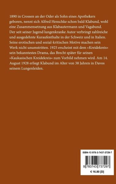 1890 in Crossen an der Oder als Sohn eines Apothekers geboren, nennt sich Alfred Henschke schon bald Klabund, wohl eine Zusammensetzung aus Klabautermann und Vagabund. Der seit seiner Jugend lungenkranke Autor verbringt zahlreiche und ausgedehnte Kuraufenthalte in der Schweiz und in Italien. Seine erotischen und sozial-kritischen Motive machen sein Werk nicht unumstritten. 1925 erscheint mit dem "Kreidekreis" sein bekanntestes Drama, das Brecht später für seinen "Kaukasischen Kreidekreis" zum Vorbild nehmen wird. Am 14. August 1928 erliegt Klabund im Alter von 38 Jahren in Davos seinem Lungenleiden.