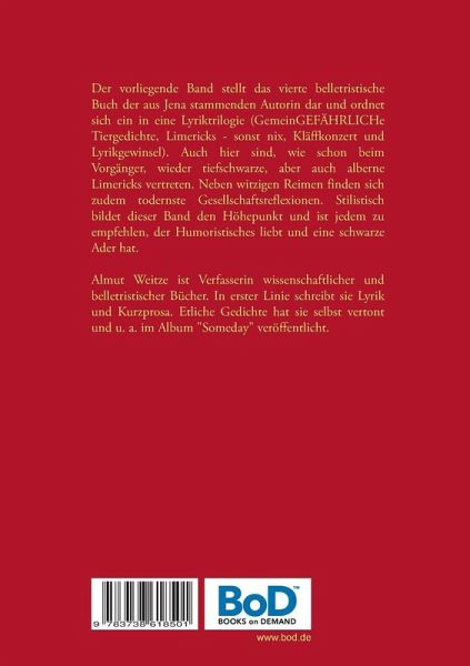 Der vorliegende Band stellt das vierte belletristische Buch der aus Jena stammenden Autorin dar und ordnet sich ein in eine Lyriktrilogie (GemeinGEFÄHRLICHe Tiergedichte, Limericks - sonst nix, Kläffkonzert und Lyrikgewinsel). Auch hier sind, wie schon beim Vorgänger, wieder tiefschwarze, aber auch alberne Limericks vertreten. Neben witzigen Reimen finden sich zudem todernste Gesellschaftsreflexionen. Stilistisch bildet dieser Band den Höhepunkt und ist jedem zu empfehlen, der Humoristisches liebt und eine schwarze Ader hat.Almut Weitze ist Verfasserin wissenschaftlicher und belletristischer Bücher. In erster Linie schreibt sie Lyrik und Kurzprosa. Etliche Gedichte hat sie selbst vertont und u. a. im Album "Someday" veröffentlicht.