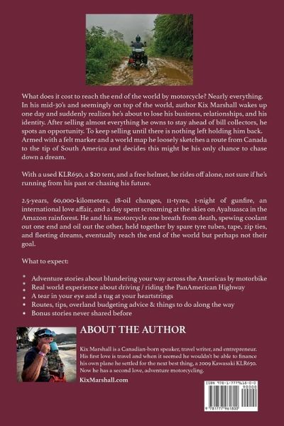 What does it cost to reach the end of the world by motorcycle? Nearly everything. In his mid-30's and seemingly on top of the world, author Kix Marshall wakes up one day and suddenly realizes he's about to lose his business, relationships, and his identity. After selling almost everything he owns to stay ahead of bill collectors, he spots an opportunity. To keep selling until there is nothing left holding him back. Armed with a felt marker and a world map he loosely sketches a route from Canada to the tip of South America and decides this might be his only chance to chase down a dream. With a used KLR650, a $20 tent, and a free helmet, he rides off alone, not sure if he's running from his past or chasing his future. 2.5-years, 60,000-kilometers, 18-oil changes, 11-tyres, 1-night of gunfire, an international love affair, and a day spent screaming at the skies on Ayahuasca in the Amazon rainforest. He and his motorcycle one breath from death, spewing coolant out one end and oil out the other, held together by spare tyre tubes, tape, zip ties, and fleeting dreams, eventually reach the end of the world but perhaps not their goal. What to expect:Adventure stories about blundering your way across the Americas by motorbike Real world experience about driving / riding the PanAmerican Highway A tear in your eye and a tug at your heartstrings Routes, tips, overland budgeting advice & things to do along the way Bonus stories never shared before