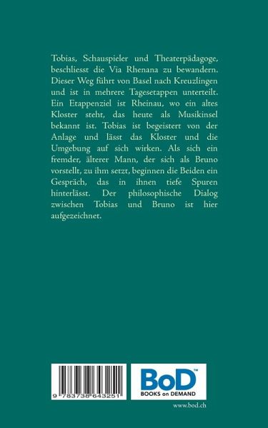 Tobias, Schauspieler und Theaterpädagoge, beschließt die Via Rhenana zu bewandern. Dieser Weg führt von Basel nach Kreuzlingen und ist in mehrere Tagesetappen unterteilt. Ein Etappenziel ist Rheinau, wo ein altes Kloster steht, das heute als Musikinsel bekannt ist. Tobias ist begeistert von der Anlage und lässt das Kloster und die Umgebung auf sich wirken. Als sich ein fremder, älterer Mann, der sich als Bruno vorstellt, zu ihm setzt, beginnen die beiden ein Gespräch, das in ihnen tiefe Spuren hinterlässt. Der philosophische Dialog zwischen Tobias und Bruno ist hier aufgezeichnet.