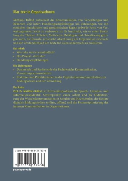 Matthias Ballod untersucht die Kommunikation von Verwaltungen und Behörden und liefert Handlungsempfehlungen um aufzuzeigen, wie mit einfachen sprachlichen und gestalterischen Regeln jedwede Form von Verwaltungstexten leicht zu verbessern ist. Er beschreibt, wie es unter Beachtung der Themen Anleiten, Motivieren, Befähigen und Orientierung gelingen kann, die formale, juristische Absicherung der Organisation einerseits und die Verständlichkeit der Texte für Laien andererseits zu realisieren.