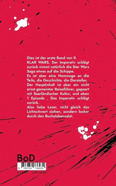 Dies ist der erste Band von 9.KLAR WARS, Der Imperativ schlägt zurück nimmt natürlich die Star Wars Saga etwas auf die Schippe.Es ist aber eine Hommage an die Teile, die Geschichte. die Darsteller.Der Hauptinhalt ist aber ein nicht ernst gemeinter Reiseführer, gepaart mit Saarländischer Kultur, und eben 1 Episode , Das Imperativ schlägt zurück.Also liebe Laser, nicht gleich das Lichtschwert ziehen, sondern locker durch den Buchstabensalat.