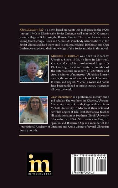 Klara Kharkov Life is a novel based on events that took place in the 1920s through 1940s in Ukraine, the Soviet Union, as well as in the XIX century Jewish village in Belorussia, the Russian Empire. The main characters are a young Jewish couple, Klara and Samuil. As somebody who was born in the Soviet Union and lived there until its collapse, Michael Blekhman and Olga Bezhanova employed their knowledge of the Soviet realities in this novel. Michael Blekhman was born in Kharkov, Ukraine. Since 1998, he lives in Montreal, Canada. Michael is a professional linguist (a PhD in linguistics) and writer, a member of the International Academy of Literature and Arts, a winner of numerous Ukrainian literary awards, the author of several books in Ukrainian, Russian, and English. Michael's stories and books have been published in various literary magazines all over the world. Olga Bezhanova is a professional literary critic and scholar. She was born in Kharkov, Ukraine, where she graduated from Kharkov State University, Department of Foreign Languages. After relocating to Montreal, Canada, she graduated from McGill University, then obtained her PhD degree at Yale. Prof. Bezhanova teaches Hispanic literature at the University of South Illinois in Edwardsville, USA. She writes in English, Spanish, and Russian. Olga is a member of the International Academy of Literature and Arts, a winner of several Ukrainian literary awards.