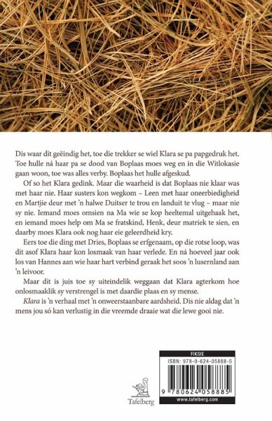 Dis waar dit geëindig het, toe die trekker se wiel Klara se pa papgedruk het. Toe hulle ná haar pa se dood van Boplaas moes weg en in die Witlokasie moes gaan woon, toe was alles verby. Boplaas het hulle afgeskud. Of so het Klara gedink. Maar die waarheid is dat Boplaas nie klaar was met haar nie. Haar susters kon wegkom - Leen met haar oneerbiedigheid en Martie deur met 'n halwe Duitser te trou en landuit te vlug - maar nie sy nie. Iemand moes omsien na Ma wie se kop heeltemal uitgehaak het, en iemand moes help om Ma se fratskind, Henk, deur matriek te sien, en daarby moes Klara ook nog haar eie geleerdheid kry. Eers toe die ding met Dries, Boplaas se erfgenaam, op die rotse loop, was dit asof Klara haar kon losmaak van haar verlede. En ná hoeveel jaar ook los van Hannes aan wie haar hart verbind geraak het soos 'n lusernland aan 'n leivoor. Maar dit is juis toe sy uiteindelik weggaan dat Klara agterkom hoe onlosmaaklik sy verstrengel is met daardie plaas en sy mense.