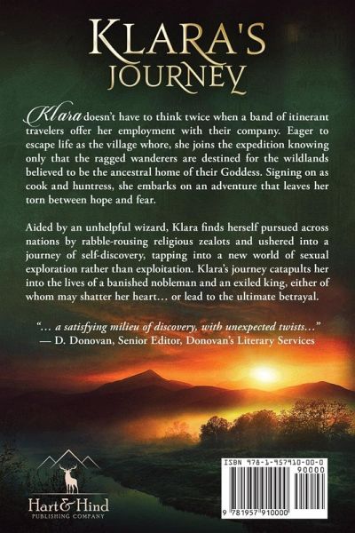 Klara doesn't have to think twice when a band of itinerant travelers offer her employment with their company. Eager to escape life as the village whore, she joins the expedition knowing only that the ragged wanderers are destined for the wildlands believed to be the ancestral home of their Goddess. Signing on as cook and huntress, she embarks on an adventure that leaves her torn between hope and fear. Aided by an unhelpful wizard, Klara finds herself pursued across nations by rabble-rousing religious zealots and ushered into a journey of self-discovery, tapping into a new world of sexual exploration rather than exploitation. Klara's journey catapults her into the lives of a banished nobleman and an exiled king, either of whom may shatter her heart... or lead to the ultimate betrayal.