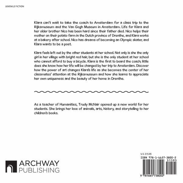 Klara can't wait to take the coach to Amsterdam for a class trip to the Rijksmuseum and the Van Gogh Museum in Amsterdam. Life for Klara and her older brother Nico has been hard since their father died. Nico helps their mother on their potato farm in the Dutch province of Drenthe, and Klara works at a bakery after school. Nico has dreams of becoming an Olympic skater, and Klara wants to be a poet. Klara feels left out by the other students at her school. Not only is she the only girl in her village with bright red hair, but she is the only student at her school who cannot afford to buy a bicycle. Klara is the first to board the coach; little does she know how her life will be changed by her trip to Amsterdam. Discover how the power of art changes Klara's life as she becomes the center of her classmates' attention at the Rijksmuseum and how she learns to appreciate her own uniqueness and the beauty of her home in Drenthe.