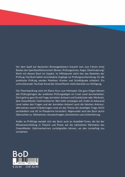 Vor dem Spaß auf deutschen Binnengewässern braucht man zum Fahren oder Chartern eines Bootes den Sportbootführerschein Binnen. Prüfungsstress, Angst, Überforderung? Nicht mit diesem Buch im Gepäck. Im Mittelpunkt steht hier das Bestehen der Prüfung. Das Buch bietet verschiedene Zugänge zur Prüfungsvorbereitung. Für die praktische Prüfung werden Manöver, Knoten und Schallsignale erläutert. Ein unterstützender YouTube-Kanal des OceanMaster steht ebenfalls zur Verfügung.Die Theorieprüfung wird mit Klarer Kurs zum Heimspiel. Die ganz Eiligen können alle Prüfungsfragen der amtlichen Prüfungsbögen im Crash Level durcharbeiten. Dort geht es ganz fix mit Frage, korrekter Antwort und Eselsbrücke oder Merksatz, dem OceanMaster-Gehirnentwirrer. Wer tiefer einsteigen will, findet im Advanced Level neben den Fragen und der korrekten Antwort auch die falschen Ankreuzalternativen sowie Erläuterungen rund um das Thema der jeweiligen Frage, leicht verständlich und oft im Plauderton formuliert.Abgerundet wird das Buch durch Übersichten aller Tafelzeichen, Ausweichregeln sowie Zusammenfassungen von Sichtzeichen und Lichterführung, die insgesamt in den amtlichen Prüfungsbögen vorkommen. Eine Matrix teilt die Prüfungsfragen in Themenkomplexe ein, so dass man sich auch gezielt auf Themenbereiche wie Umweltschutz oder Schallsignale vorbereiten kann.Außer an Prüflinge wendet sich das Buch auch an Ausbilder_innen, die bei der Wissensvermittlung in Theorie und Praxis auf die zahlreichen Merksätze des OceanMaster-Gehirnentwirrers zurückgreifen können, um den Lernerfolg zu verstärken.