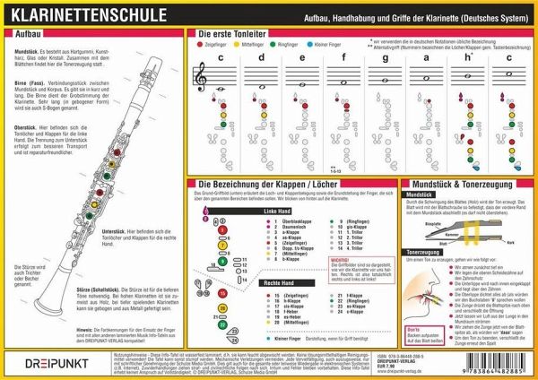 Die Klarinette ist ein Holzblasinstrument, das sich durch ihren weichen, voluminösen Ton auszeichnet. Ausgestattet mit Löchern (wie eine Flöte) und Klappen (mit dem Saxophon vergleichbar), ist die Klarinette ein sehr vielseitiges Instrument mit einem großen Tonumfang. Für Anfänger und Fortgeschrittene gleichermaßen geeignet. Erlernen Sie das Klarinettenspiel und starten Sie mit dieser hochwertig wasserfest und unzerreißbar laminierten Info-Tafel.