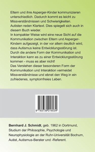 Eltern und ihre Asperger-Kinder kommunizieren unterschiedlich. Dadurch kommt es leicht zu Missverständnissen und Schwierigkeiten.Autisten reden Klartext. Dies spiegelt sich auch in diesem Buch wieder.In kompakter Weise wird eine neue Sicht auf die Kommunikation zwischen Eltern und Asperger-Kindern aufgezeigt, in der vor allem deutlich wird, dass Autismus keine Entwicklungsstörung ist.Durch die andere Form der Kommunikation und Interaktion kann es zu einer Entwicklungsstörung kommen - muss es aber nicht!Das Verstehen dieser besonderen Form der Kommunikation und Interaktion vermeidet Missverständnisse und ebnet den Weg in ein zufriedenes, symptomfreies Leben.Weitere Informationen sowie die Liste meiner Veröffentlichungen zum Thema Autismus finden Sie aufwww.autismusberatung.info