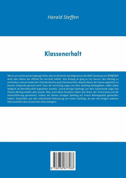 Wenn uns vorher jemand gesagt hätte, dass es die beste Zweitligasaison des MSV Duisburg seit 2008/2009 wird, den hätten wir offiziell für verrückt erklärt. Von Anfang an ging es nur darum, den Abstieg zu verhindern. Darum lautet der Titel des Buches auch Klassenerhalt, obwohl dieser der Saison eigentlich zu keinem Zeitpunkt gerecht wird. Dass wir kurzfristig sogar mit dem Aufstieg liebäugelten, sollte dabei lediglich als Betriebsunfall angesehen werden. Zumal wenige Spieltage vor dem Saisonende sogar das Thema Abstieg wieder akut wurde. Aber auch diese Situation haben das Team, der Trainerstab und die Vereinsführung gemeistert, sodass wir keinen einzigen Spieltag auf einem Abstiegsplatz gestanden haben. Tatsächlich war die schlechteste Platzierung am ersten Spieltag, als wie mit einigen anderen Mannschaften den vierzehnten Platz belegten.