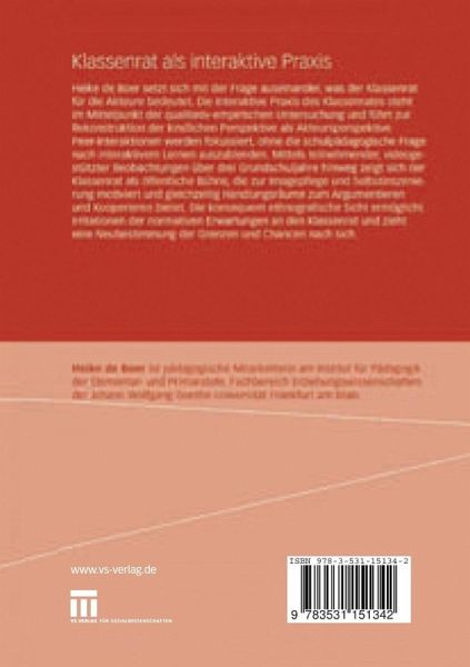 Heike de Boer setzt sich mit der Frage auseinander, was der Klassenrat für die Akteure bedeutet. Die interaktive Praxis des Klassenrates steht im Mittelpunkt der qualitativ-empirischen Untersuchung und führt zur Rekonstruktion der kindlichen Perspektive als Akteursperspektive. Peer-Interaktionen werden fokussiert, ohne die schulpädagogische Frage nach interaktivem Lernen auszublenden. Die konsequent ethnografische Sicht ermöglicht Irritationen der normativen Erwartungen an den Klassenrat und zieht eine Neubestimmung der Grenzen und Chancen nach sich.