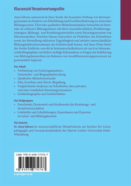 Anja Gibson untersucht in ihrer Studie die besondere Stellung von Internatsgymnasien im Kontext von Elitebildung und Exzellenzförderung im deutschen Bildungssystem. Über eine qualitative Mehrebenenanalyse betrachtet sie Internate als exklusive Bildungsräume mit ihren Auswahlverfahren, Profilierungsstrategien, Bildungs- und Erziehungsentwürfen sowie Deutungsmustern von Elitesemantiken. Darüber hinaus beleuchtet sie Praktiken der Distinktion sowie der Herstellung exklusiver Zugehörigkeit und arbeitet unterschiedliche Bildungshabitusformationen der Schülerschaft heraus. Auf diese Weise bietet die Studie Einblicke sowohl in Internatsschulkulturen als auch in Internatsschülerbiographien und liefert wichtige Erkenntnisse zu Fragen der Etablierung von Bildungshierarchien im Rahmen von Ausdifferenzierungsprozessen im gymnasialen Segment.