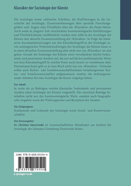 Die Soziologie kennt zahlreiche Schriften, die Einführungen in die Geschichte der Soziologie, Zusammenfassungen über spezielle Forschungsgebiete und -fragen oder Überblicke über die 'Klassiker' des Fachs bieten. Auch wenn in jüngster Zeit verschiedene kunstsoziologische Einführungen und Überblicksbände veröffentlicht worden sind, fehlt in der Soziologie der Künste eine aktuelle Zusammenstellung der 'Klassiker'. In Folge der intensiven Auseinandersetzungen um den Klassikerbegriff in der Soziologie sowie umfangreicher Weiterentwicklungen der Soziologie der Künste kann es in einer aktuellen Zusammenstellung aber nicht nur um 'Klassiker' an sich gehen. Gerade die Soziologie der Künste weist verschiedene höchst bedeutende und prominente Ansätze auf, die nur auf höchst problematische Weise mit dem Klassikerbegriff in welcher Form auch immer zu vereinbaren sind. Dementsprechend geht es in dem Buch nicht nur um 'Klassiker'. Vielmehr sollen auch Kultur- und Sozialwissenschaftlerinnen beziehungsweise Kultur- und Sozialwissenschaftler aufgenommen werden, die richtungsweisende Arbeiten für eine Soziologie der Kunst vorgelegt haben.