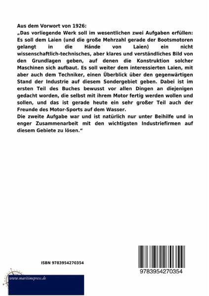 Aus dem Vorwort von 1926: Das vorliegende Werk soll im wesentlichen zwei Aufgaben erfüllen: Es soll dem Laien (und die große Mehrzahl gerade der Bootsmotoren gelangt in die Hände von Laien) ein nicht wissenschaftlich-technisches, aber klares und verständliches Bild von den Grundlagen geben, auf denen die Konstruktion solcher Maschinen sich aufbaut. Es soll weiter dem interessierten Laien, mit aber auch dem Techniker, einen Überblick über den gegenwärtigen Stand der Industrie auf diesem Sondergebiet geben. Dabei ist im ersten Teil des Buches bewusst vor allen Dingen an diejenigen gedacht worden, die selbst mit ihrem Motor fertig werden wollen und sollen, und das ist gerade heute ein sehr großer Teil auch der Freunde des Motor-Sports auf dem Wasser.