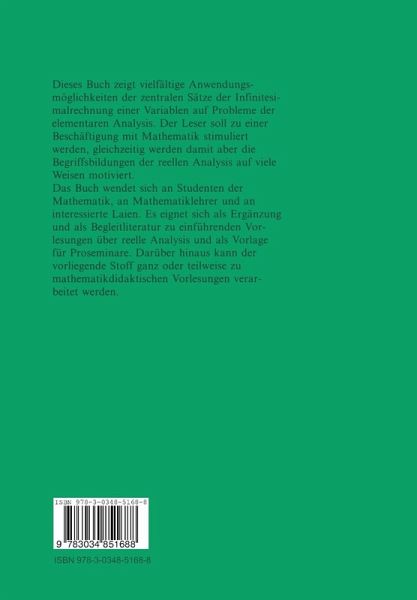 Fur Hansi Dieses Buch will die vielfiiltigen Anwendungsmoglichkeiten der zentralen Satze der Infinitesimalrechnung einer Variablen exemplarisch aufzeigen: Der Leser solI dadurch zu einer Beschaftigung mit Mathematik stimuliert werden, gleich zeitig werden damit aber die Begriffsbildungen der reellen Analysis auf beson dere Weise motiviert. Das vorliegende Buch wendet sich an Studenten in mittleren und hohe ren Semestern, an Mathematiklehrer und an interessierte Laien. Es eignet sich als Erganzung und als Begleitliteratur zu einfUhrenden Vorlesungen uber reelle Analysis und als Vorlage fUr Proseminare. Daruber hinaus kann der vorliegende Stoff ganz oder teilweise zu mathematikdidaktischen Vorlesungen verarbeitet werden. Aber auch der Kenner wird neue Varianten finden (z. B. 111.4.5 (5) oder V.5.5). Ein Zit at 111.5.2 bedeutet Abschnitt 2 im Paragraphen 5 des Kapitels III. Innerhalb eines Kapitels wird die (romische) Kapitelnummer, innerhalb eines Paragraphen die Paragraphennummer weggelassen, entsprechend wird inner halb eines Abschnitts vorgegangen. Eine in Klammern angefUgte Zahl bezeich net die Nummer einer Gleichung. Abschnitte und Paragraphen, die mit einem Stern gekennzeichnet sind, konnen (und soIlen) bei der ersten Lekture fort gelassen werden. Dieser Text ist aus einer Vorlesung zur Fachdidaktik, die ich mehrfach an der Universitat Munster gehalten habe, entstanden. Dabei wurde ich bei der Durchsicht der Manuskripte von meinen Mitarbeitern Dr. E. NEHER, Dr. J. HEINZE, Dr. A. KRIEG und N. KOTISSEK tatkraftig unterstutzt, ihnen allen gilt mein Dank. Das endgiiItige Manuskript war im Fruhjahr 1985 fertiggestellt.