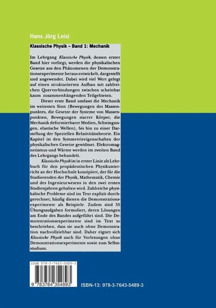 Im Lehrgang Klassische Physik, dessen erster Band hier vorliegt, werden die physikalischen Gesetze aus den Phänomenen der Demonstrationsexperimente heraus entwickelt, dargestellt und angewendet. Dabei wird viel Wert gelegt auf einen strukturierten Aufbau mit zahlreichen Querverbindungen zwischen scheinbar kaum zusammenhngenden Teilgebieten. Dieser erste Band umfasst die Mechanik im weitesten Sinn (Bewegungen des Massenpunktes, die Gesetze der Systeme von Massenpunkten, Bewegungen starrer Körper, die Mechanik deformierbarer Medien, Schwingungen, elastische Wellen), bis hin zu einer Darstellung der Speziellen Relativitätstheorie. Ein Kapitel ist den Symmetrieeigenschaften der physikalischen Gesetze gewidmet. Elektromagnetismus und Wärme werden im zweiten Band des Lehrgangs behandelt. Klassische Physik ist in erster Linie als Lehrbuch für den propädeutischen Physikunterricht an der Hochschule konzipiert, der für die Studierenden der Physik, Mathematik, Chemie und des Ingenieurwesensin den zwei ersten Studienjahren gehalten wird. Zahlreiche physikalische Probleme sind im Text explizit durchgerechnet; häufig dienen die Demonstrationsexperimente als Beispiele. Zudem sind 55 Übungsaufgaben formuliert, deren Lösungen am Ende des Bandes aufgeführt sind. Die Demonstrationsexperimente sind im Text so beschrieben, dass sie auch ohne Demonstration nachvollziehbar sind. Daher eignet sich Klassische Physik auch für Vorlesungen ohne Demonstrationsexperimente sowie zum Selbststudium.