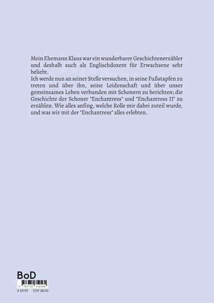 Mein Ehemann Klaus war ein wunderbarer Geschichtenerzähler und deshalb auch als Englischdozent für Erwachsene sehr beliebt. Ich werde nun an seiner Stelle versuchen, in seine Fußstapfen zu treten und über ihn, seine Leidenschaft und über unser gemeinsames Leben verbunden mit Schonern zu berichten; die Geschichte der Schoner "Enchantress" und "Enchantress II" zu erzählen. Wie alles anfing, welche Rolle mir dabei zuteil wurde, und was wir mit der "Enchantress" alles erlebten.