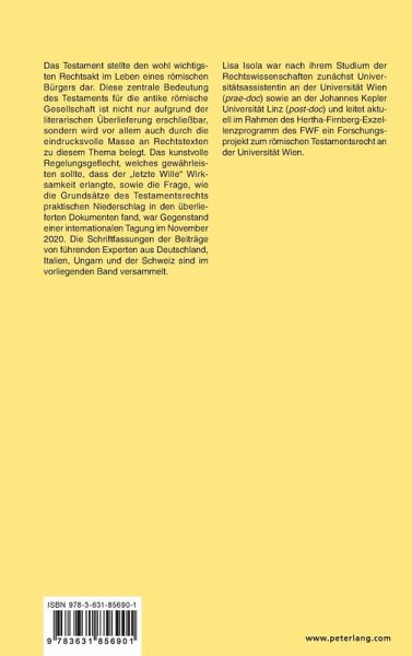 Das Testament stellte den wohl wichtigsten Rechtsakt im Leben eines römischen Bürgers dar. Diese zentrale Bedeutung des Testaments für die antike römische Gesellschaft ist nicht nur aufgrund der literarischen Überlieferung erschließbar, sondern wird vor allem auch durch die eindrucksvolle Masse an Rechtstexten zu diesem Thema belegt. Das kunstvolle Regelungsgeflecht, welches gewährleisten sollte, dass der «letzte Wille» Wirksamkeit erlangte, sowie die Frage, wie die Grundsätze des Testamentsrechts praktischen Niederschlag in den überlieferten Dokumenten fand, war Gegenstand einer internationalen Tagung im November 2020. Die Schriftfassungen der Beiträge von führenden Experten aus Deutschland, Italien, Ungarn und der Schweiz sind im vorliegenden Band versammelt.