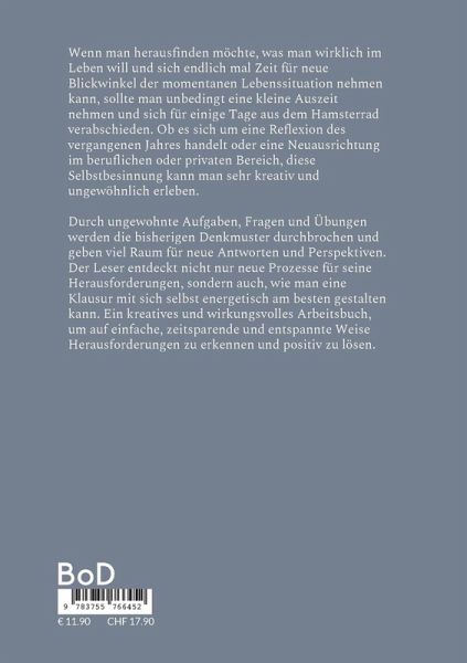 Wenn man herausfinden möchte, was man wirklich im Leben will und sich endlich mal Zeit für neue Blickwinkel der momentanen Lebenssituation nehmen kann, sollte man unbedingt eine kleine Auszeit nehmen und sich für einige Tage aus dem Hamsterrad verabschieden. Ob es sich um eine Reflexion des vergangenen Jahres handelt oder eine Neuausrichtung im beruflichen oder privaten Bereich, diese Selbstbesinnung kann man sehr kreativ und ungewöhnlich erleben. Durch ungewohnte Aufgaben, Fragen und Übungen werden die bisherigen Denkmuster durchbrochen und geben viel Raum für neue Antworten und Perspektiven. Der Leser entdeckt nicht nur neue Prozesse für seine Herausforderungen, sondern auch, wie man eine Klausur mit sich selbst energetisch am besten gestalten kann. Ein kreatives und wirkungsvolles Arbeitsbuch, um auf einfache, zeitsparende und entspannte Weise Herausforderungen zu erkennen und positiv zu lösen.