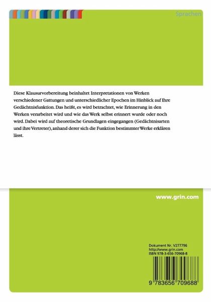 Prüfungsvorbereitung aus dem Jahr 2014 im Fachbereich Literaturwissenschaft - Allgemeines, Martin-Luther-Universität Halle-Wittenberg (Institut für Germanistik), Veranstaltung: Funktionen der Literatur im kommunikativen/kulturellen Gedächtnis, Sprache: Deutsch, Anmerkungen: Die Klausurvorbereitung wurde nicht von einem Dozenten durchgesehen oder bewertet, doch verhalf mir als Lernhilfe zu einer 1,3. , Abstract: Diese Klausurvorbereitung beinhaltet Interpretationen von Werken verschiedener Gattungen und unterschiedlicher Epochen im Hinblick auf Ihre Gedächtnisfunktion. Das heißt, es wird betrachtet, wie Erinnerung in den Werken verarbeitet wird und wie das Werk selbst erinnert wurde oder noch wird. Dabei wird auf theoretische Grundlagen eingegangen (Gedächtnisarten und ihre Vertreter), anhand derer sich die Funktion bestimmter Werke erklären lässt.