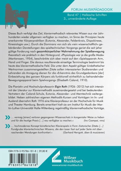 Dieses Buch verfolgt das Ziel, klaviermethodisch relevantes Wissen aus vier Jahrhunderten wieder allgemein verfügbar zu machen, im Sinne der Prinzipien heute anerkannter Körperpraktiken (Eutonie, Alexander, Feldenkrais, Dispokinese, Kinesiologie usw.). Durch die Dominanz von sich als »rein wissenschaftlich« gebärdenden Darstellungen des spieltechnischen Vorgangs geriet die seit jeher gültige Forderung nach gesamtkörperlicher Wahrnehmung der Spielbewegung theoretisch wie praktisch in den Hintergrund. »Physiologie war ja die große Mode« (Martienssen, 1954), beschränkte sich aber meist auf den »Spielapparat« Arm, Hand und Finger. Die daraus resultierende einseitige Terminologie bestimmt bis heute das klaviermethodische Feld. Die unter dem Aspekt gültiger kinästhetischer Wertnormen zusammengestellten Zitate sollen interessierten Studierenden und Lehrenden als Anregung dienen für die »Erkenntnis des Grundgedankens [der] Einbeziehung des ganzen Körpers als funktionell einheitlich zu behandelnder Bewegungsapparat beim Spielvorgang« (Elisabeth Caland, 1910).Noch zu Lebzeiten legte die Autorin Elgin Roth eine revidierte und um Kapitelkommentare erweiterte Neuauflage von »Klavierspiel und Körperbewusstsein« vor, die 2013 unter der Herausgeberschaft von Prof. Marco Antonio de Almeida erschien und in der 3. Auflage unverändert nachgedruckt wurde.