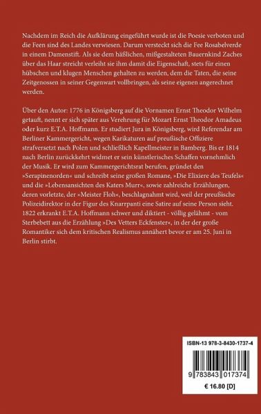 1776 in Königsberg auf die Vornamen Ernst Theodor Wilhelm getauft, nennt er sich später aus Verehrung für Mozart Ernst Theodor Amadeus oder kurz E.T.A. Hoffmann. Er studiert Jura in Königsberg, wird Referendar am Berliner Kammergericht, wegen Karikaturen auf preußische Offiziere strafversetzt nach Polen und schließlich Kapellmeister in Bamberg. Bis er 1814 nach Berlin zurückkehrt widmet er sein künstlerisches Schaffen vornehmlich der Musik. Er wird zum Kammergerichtsrat berufen, gründet den "Serapinenorden" und schreibt seine großen Romane, "Die Elixiere des Teufels" und die "Lebensansichten des Katers Murr", sowie zahlreiche Erzählungen, deren vorletzte, der "Meister Floh", beschlagnahmt wird, weil der preußische Polizeidirektor in der Figur des Knarrpanti eine Satire auf seine Person sieht. 1822 erkrankt E.T.A. Hoffmann schwer und diktiert - völlig gelähmt - vom Sterbebett aus die Erzählung "Des Vetters Eckfenster", in der der große Romantiker sich dem kritischen Realismus annähert bevor er am 25. Juni in Berlin stirbt.