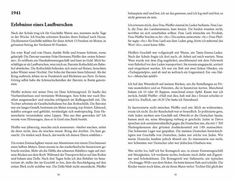 Der London Daily Telegraph schrieb im Herbst 1945: "Davos ist in der ganzen Schweiz als KleinBerlin bekannt und war bis zum Zusammenbruch des Dritten Reiches das deutsche Verschwörungs- und Spionagezentrum." Der mondäne Kurort war in den Jahren 1939 bis 1945 nicht nur Kurort, sondern auch Zufluchtsort, Lebensraum und politisches Spannungsfeld. Rund 1.500 Deutsche lebten damals im Landwassertal, nicht wenige von ihnen mit NSDAP-Mitgliedschaft, Hitlergruß und Hakenkreuzfahne gehörten zum Alltag. Der autobiografisch gefärbte Text verwebt persönliche Erinnerungen mit Zeitdokumenten und Presseausschnitten und beleuchtet als vielschichtige Chronik eine weitgehend vergessene Seite der Davoser Geschichte. Erzählt wird von einer Jugend im Schatten des Krieges - vom nächtlichen Schneeschaufeln bei bitterer Kälte, von Schreinerlehrlingen, die Tote begruben und von den Schwimmfesten am Davosersee. Zwischen Dorfbewohnern, Flüchtlingen und überzeugten Nationalsozialisten entfalten sich zahlreiche Szenen, die das grosse Weltgeschehen im Kleinen widerspiegeln.