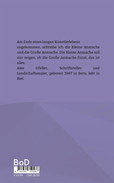 Am Ende eines langen Künstlerlebens angekommen, schreibe ich die Kleine Anmache und die Große Anmache. Die Kleine Anmache soll mir zeigen, ob die Große Anmache funzt, das ist alles. Alex Gfeller, Schriftsteller und Landschaftsmaler, geboren 1947 in Bern, lebt in Biel.