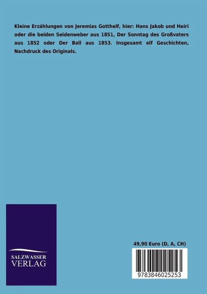 Kleine Erzählungen von Jeremias Gotthelf, hier: Hans Jakob und Heiri oder die beiden Seidenweber aus 1851, Der Sonntag des Großvaters aus 1852 oder Der Ball aus 1853. Insgesamt elf Geschichten, Nachdruck des Originals.