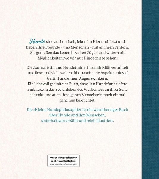 Hunde sind authentisch, leben im Hier und Jetzt und lieben ihre Freunde (uns Menschen) mit all ihren Fehlern. Sie sehen Möglichkeiten und keine Hindernisse und genießen das Leben in vollen Zügen. Die Journalistin und Hundetrainerin Sarah Klüß vermittelt uns diese und überraschende weitere Aspekte mit viel Gefühl und einem Augenzwinkern. Ein liebevoll gestaltetes Buch, das allen Hundefans tiefere Einblicke in das Seelenleben des Vierbeiners an ihrer Seite schenkt und auch ihr eigenes Menschsein noch einmal ganz neu beleuchtet. Die kleine Hundephilosophie ist somit viel mehr als nur ein Ratgeber über Haustiere - es ist ein Buch darüber, was wir von unseren Hunden lernen können.