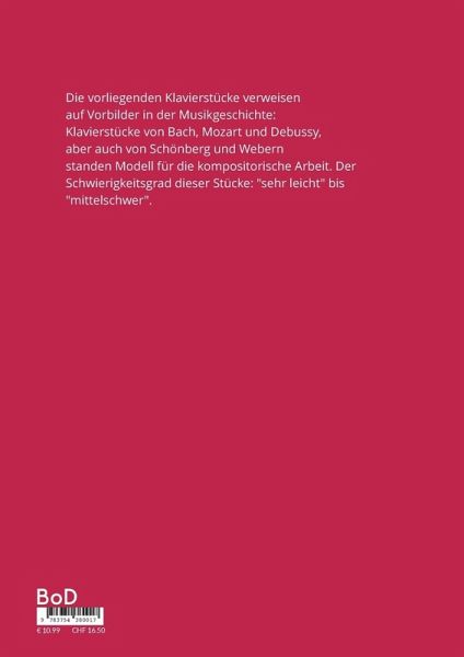 Die vorliegenden Klavierstücke verweisen auf Vorbilder in der Musikgeschichte:Klavierstücke von Bach, Mozart und Debussy, aber auch von Schönberg und Webern standen Modell für die kompositorische Arbeit. Der Schwierigkeitsgrad dieser Stücke beläuft sich zwischen "sehr leicht" bis "mittelschwer".