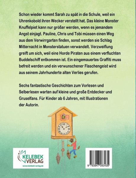 Schon wieder kommt Sarah zu spät in die Schule, weil ein Uhrenkobold ihren Wecker verstellt hat. Das kleine Monster Knuffelpiet kann nur größer werden, wenn es jemandem Angst einjagt. Pauline, Chris und Tobi müssen einen Weg aus dem Verwirrgarten finden, sonst werden sie Schlag Mitternacht in Monsterstatuen verwandelt. Verzweiflung greift um sich, weil eine Horde Piraten aus einem verfluchten Buddelschiff entkommen ist. Ein eingemauertes Graffiti muss befreit werden und ein verwunschener Flaschengeist wird aus seinem Jahrhunderte alten Verlies gerufen. Sechs fantastische Geschichten zum Vorlesen und Selberlesen warten auf kleine und große Entdecker und Gruselfans. Für Kinder ab 6 Jahren, mit Illustrationen der Autorin.