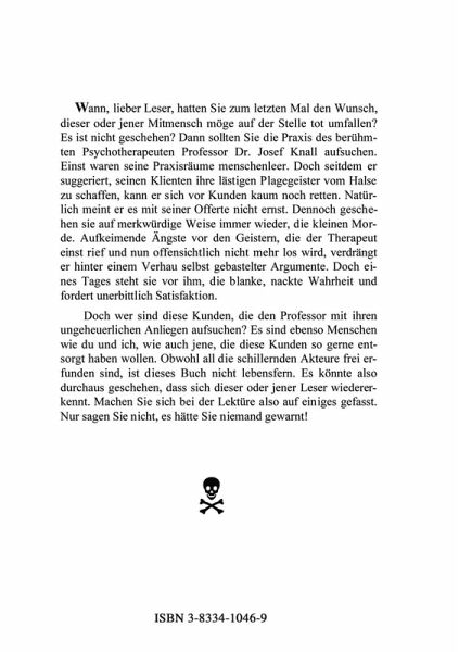 Wann hatten Sie zum letzten Mal den Wunsch, jener böse Mitmensch möge auf der Stelle tot umfallen? Es ist nicht geschehen? Dann sollten Sie die Praxis des berühmten Psychotherapeuten Professor Knall aufsuchen. Seitdem er suggeriert, seinen Klienten ihre Plagegeister vom Halse zu schaffen, kann er sich vor Kunden kaum noch retten. Natürlich meint er es mit seiner Offerte nicht ernst. Dennoch geschehen die kleinen Morde immer wieder. Ängste vor den Geistern, die er einst rief, verdrängt er hinter einem Verhau selbst gebastelter Argumente. Doch eines Tages steht vor ihm die nackte Wahrheit und fordert unerbittlich Kompensation. Die Kunden, die den Professor mit ihren ungeheuerlichen Anliegen aufsuchen, sind Menschen wie du und ich, auch jene, die diese Kunden so gerne entsorgt haben wollen. Es könnte also geschehen, dass sich ein Leser wiedererkennt. Machen Sie sich bei der Lektüre also auf einiges gefasst. Nur sagen Sie nicht, es hätte Sie niemand gewarnt!